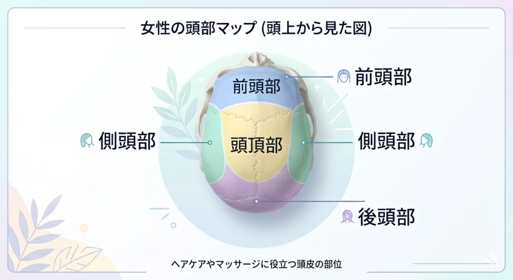 頭皮は大きく4つのゾーンに分かれます。それぞれが連動しているため、まんべんなくケアすることが大切です。